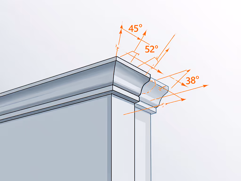 - Bevel angle = arcsin(sin(spring angle) × sin(wall angle / 2)) Example: 89° corner → 35.1° miter, 30.2° bevel