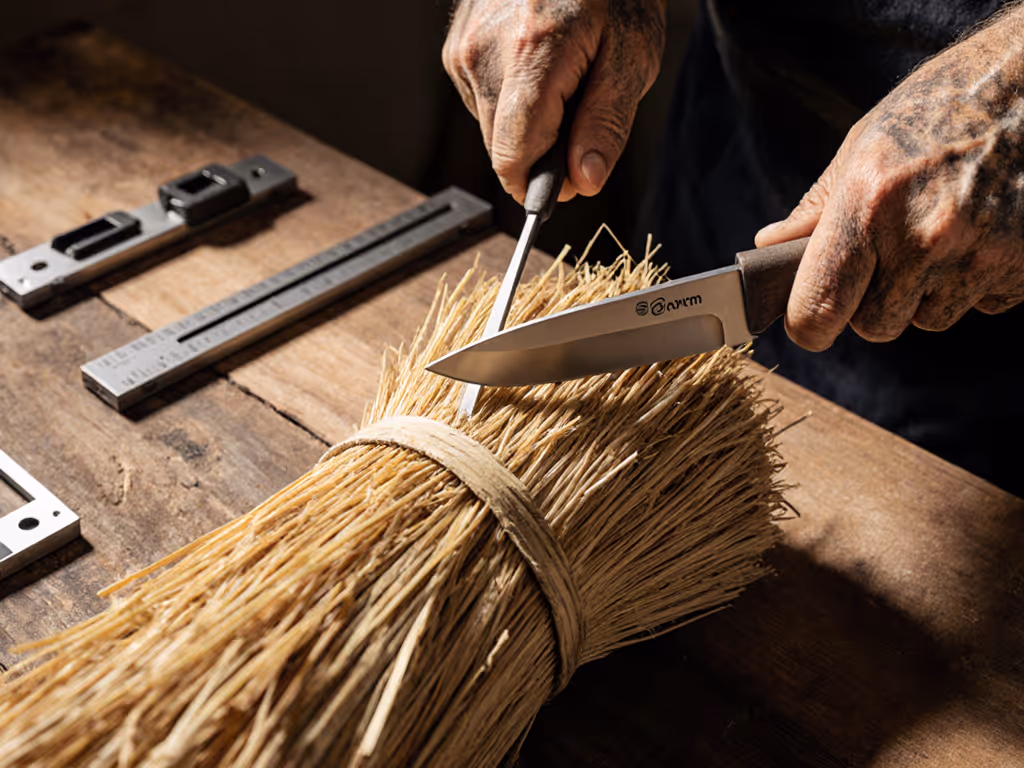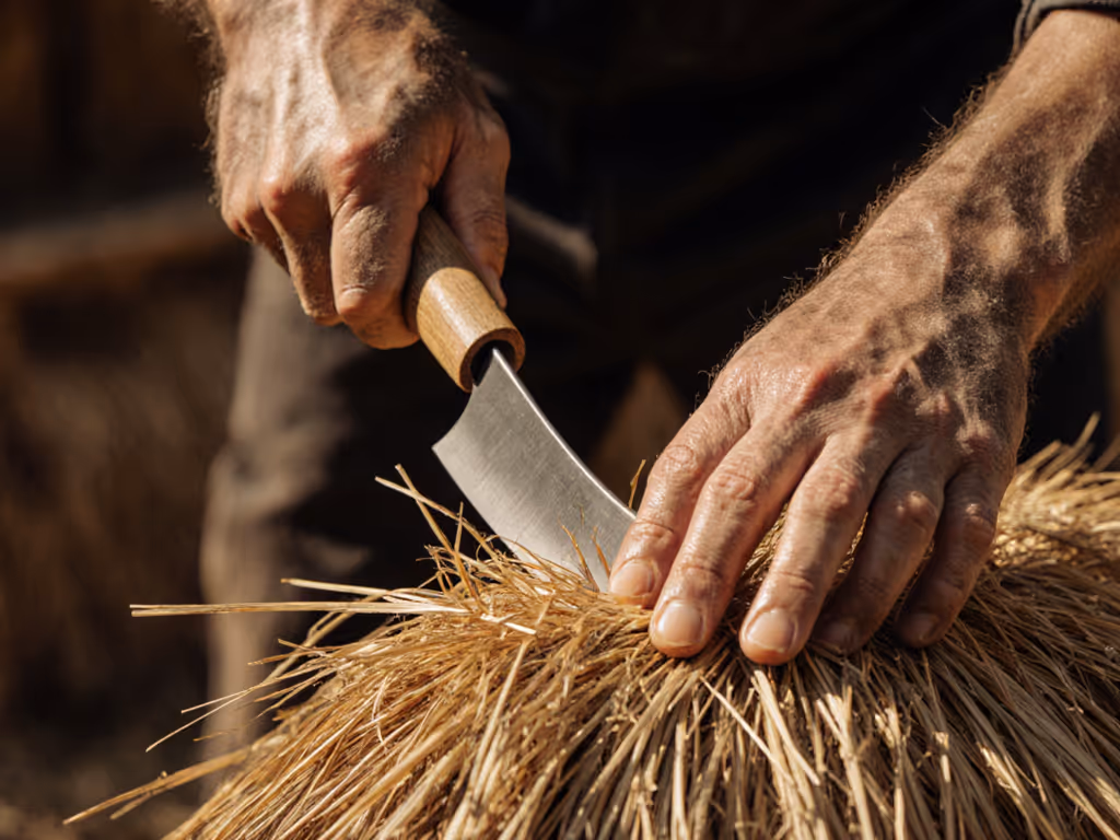 Thatchers use specialized knives with 250 mm blades and 15-degree bevels. Key metrics: